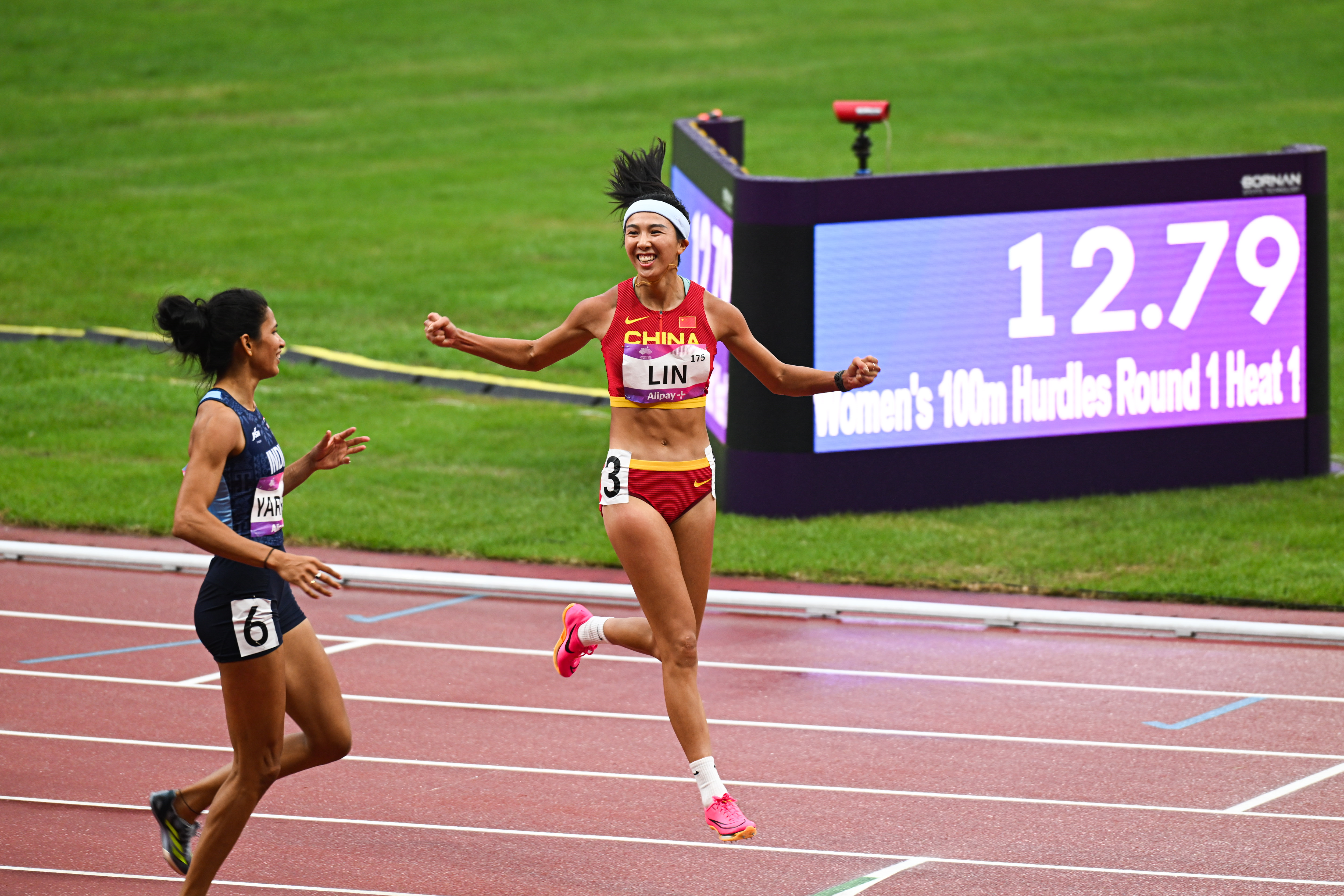 9月30日,亚运会女子100米栏预赛中,中国选手林雨薇与吴艳妮以预赛前两名顺利晋级。林雨薇跑出12秒79,创造了个人最好成绩,虽然比赛在雨中进行,她坦言并无影响,“无论烈日还是暴雨,我都进行过高强度训练,这是水到渠成的结果,我会在决赛中继续去拼。”吴艳妮跑出12秒80。期待中国双姝在10月1日晚21时15分决赛中有精彩表现。(中青报·中青网记者 梁璇 视觉中国 供图)
