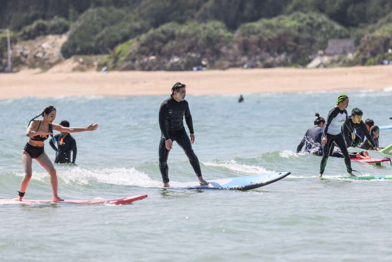 2月13日,游客在海南三亚皇后湾海域体验冲浪运动。新华社记者 张丽芸 摄