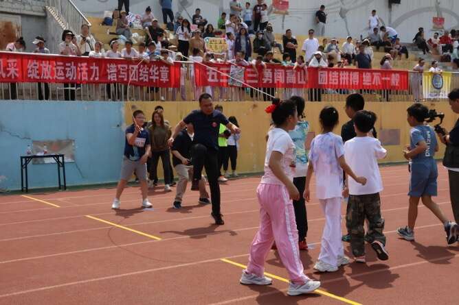 开幕式上,孩子们身着各类民族服饰,唱起《爱我中华》,跳起蒙古舞蹈……田径场成了展示民族文化的露天舞台。“开幕式节目就是我们的一大亮点,绝大部分节目都是孩子们自己选定,自编自演的。”总裁判长乔石说,民族体育亲子运动会以改良后的民族体育项目为主,“让家长与孩子携手运动,不仅能增进孩子与家长的感情,也能让家长和孩子一起强身健体,同时还能促进家校配合与协作。”