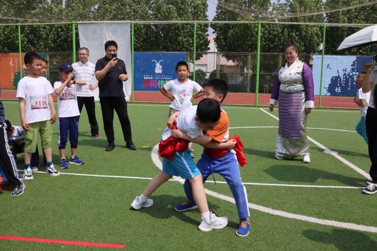 三年级的杨承瑄是这场“摔跤赛”的其中一位获胜者。“这是我第一次摔跤,平时我和妈妈只是一起跳绳,但是以后我想带妈妈体验更多民族运动。”