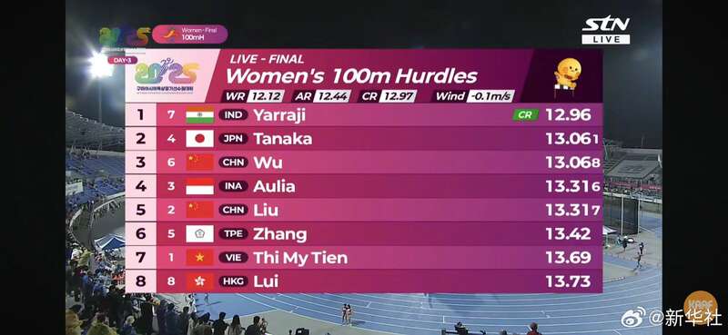 北京时间5月29日晚,在韩国龟尾进行的2025年亚洲田径锦标赛女子100米栏决赛中,中国选手吴艳妮以13秒07的成绩夺得铜牌,印度选手、卫冕冠军亚拉吉以12秒96的成绩夺得冠军,日本名将田中佑美获得亚军,另一名中国选手刘景扬位列第五。