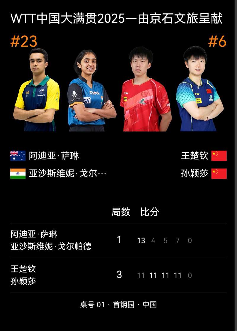 中国青年报客户端北京9月30日电(中青报·中青网记者慈鑫)今晚进行的一场2025WTT世界乒联中国大满贯混双首轮比赛,巴黎奥运会和三届世锦赛该项目冠军、”莎头”组合王楚钦/孙颖莎以3:1战胜跨国组合萨琳/戈尔帕德。