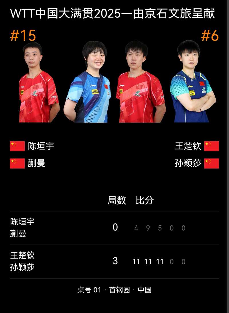 中国青年报客户端北京10月1日电(中青报·中青网记者 慈鑫)2025WTT世界乒联中国大满贯今天在北京继续进行。“莎头“组合王楚钦/孙颖莎今晚在混双四分之一决赛中以3:0战胜队友陈垣宇/蒯曼,晋级到混双半决赛。他们将在明晚迎战巴西组合雨果·卡尔德拉诺/高桥·布鲁娜。