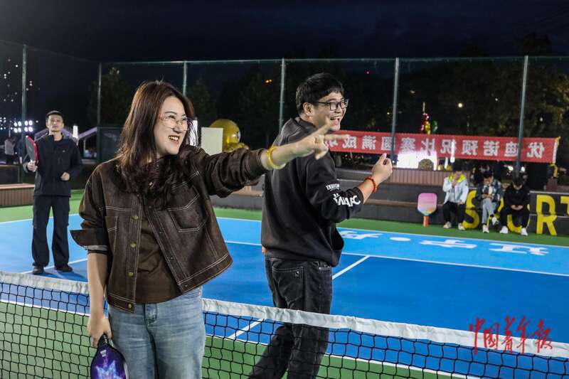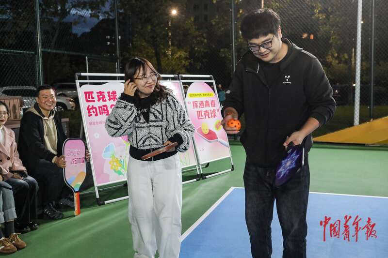 10月11日,辽宁丹东新区玉带河公园,前来参加匹克球主题交友会的王艺璇(左)与吴伯阳在比赛前通过猜拳决定发球方。王艺璇是一名90后,在微信群里看到匹克球主题交友会,刚刚接触匹克球不久的她想借此机会“练练手”。她认为,比起传统的交友会,以匹克球为主题的交友会形式新颖,能让年轻人在互动中自然地拉近距离,还可以锻炼身体,减轻工作压力。中青报·中青网记者 孔斯琪/摄