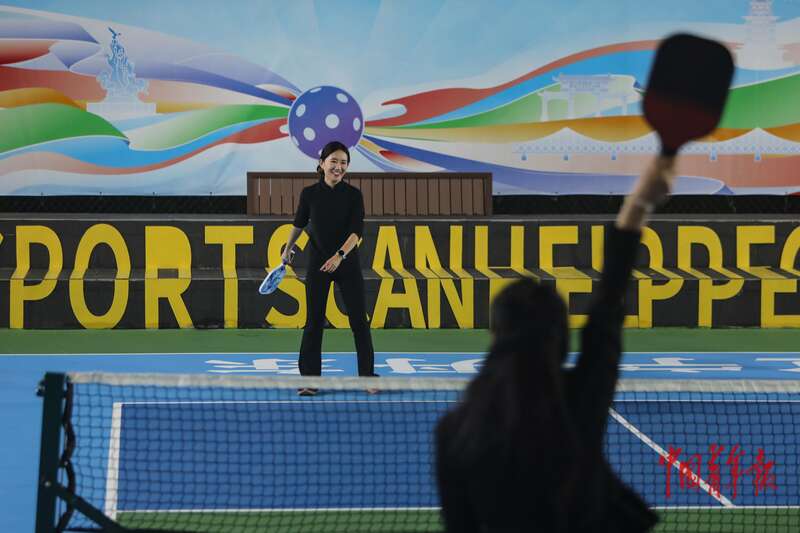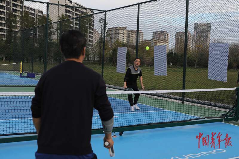 10月11日,辽宁丹东新区玉带河公园,一场匹克球交流赛即将进行,参赛者在进行热身练习。中青报·中青网记者 孔斯琪/摄