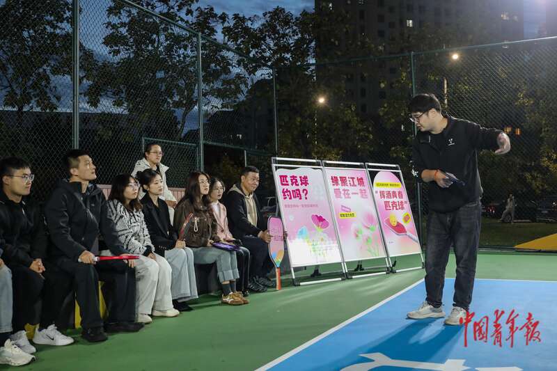 10月11日,辽宁丹东新区玉带河公园,95后丹东小伙吴伯阳(右一)在为参加“匹克球”交友会的年轻人们讲解匹克球的发球方式和相关规则。当日,一场特殊的交友会在这里举行,不少当地年轻人走进球场感受匹克球运动的魅力,在轻松愉悦的氛围中打破“社恐”,以球会友,增进交流。作为一项融合了网球、羽毛球和乒乓球运动元素的新兴体育项目,匹克球具有设备简单、易于上手、适合全年龄段参与等特点。近年来,匹克球、飞盘、陆冲等新兴运动在年轻人中迅速走红,也成为社交新方式。中青报·中青网记者 孔斯琪/摄