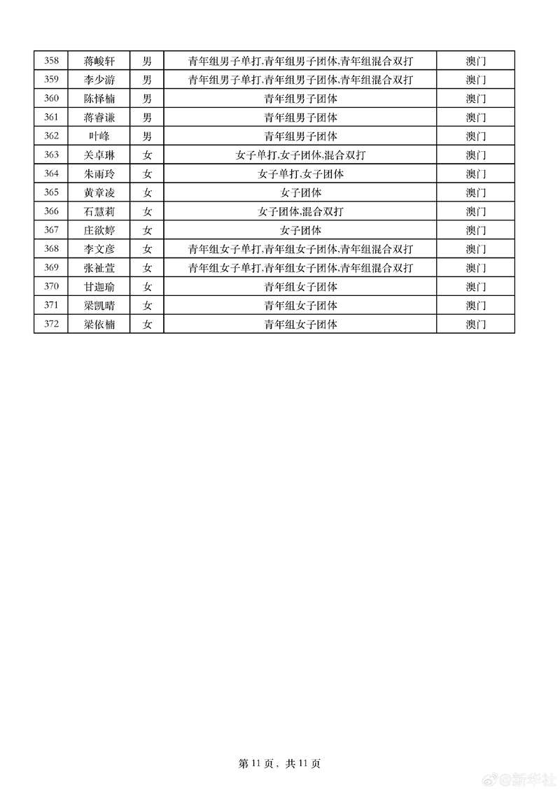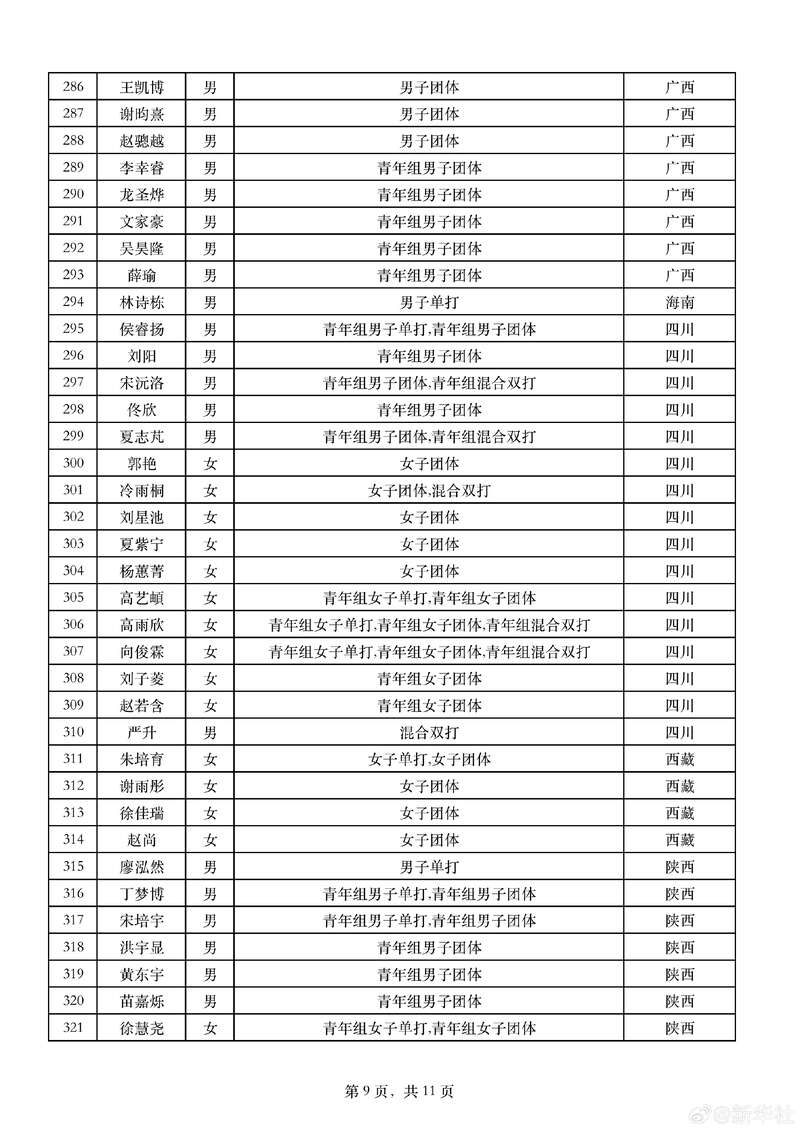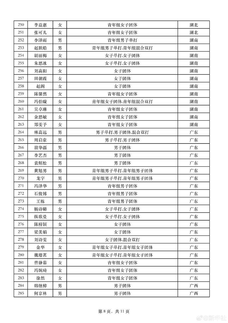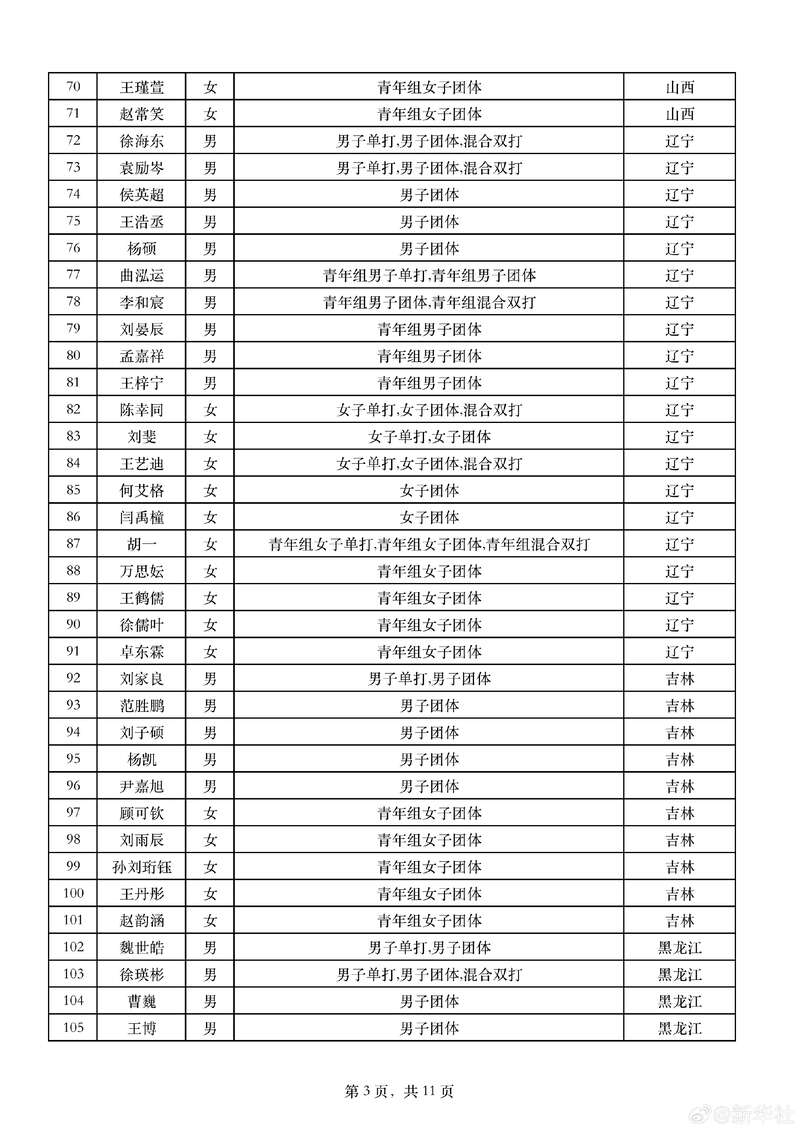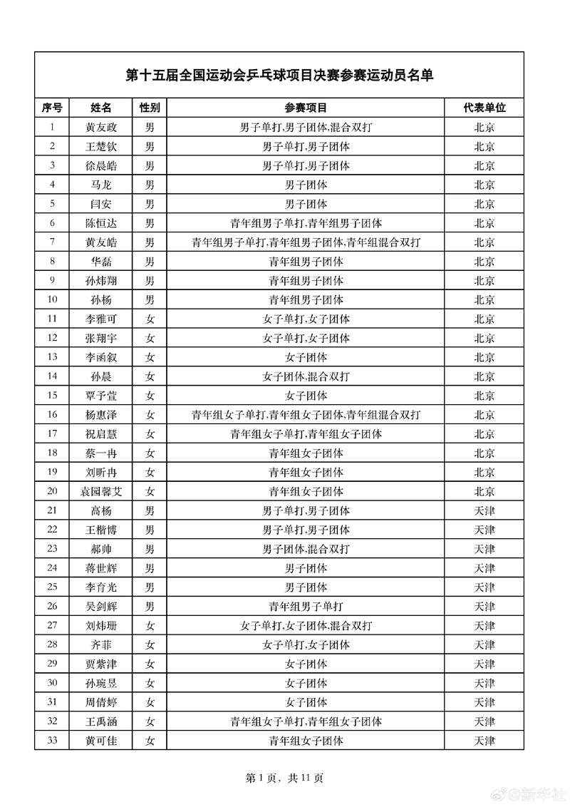 全运会乒乓球运动员报项公示 马龙樊振东孙颖莎参加这些项目