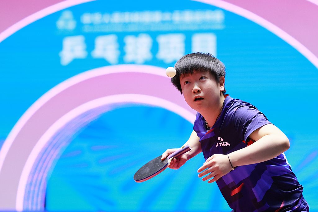 孙颖莎在今天的女团四分之一决赛中。视觉中国供图