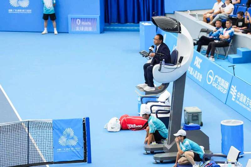 这是11月15日在广东珠海横琴网球中心拍摄的智能电动升降裁判椅。