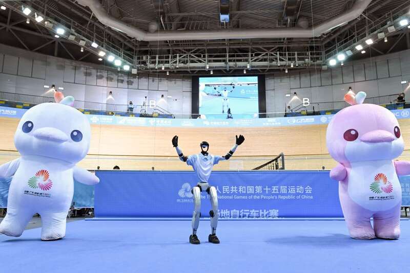 11月13日,参与场地自行车女子团体竞速赛决赛赛前表演的机器人向现场观众招手互动。