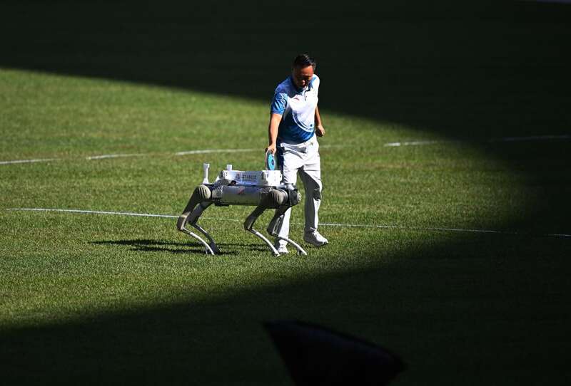 11月15日,机器狗在田径项目女子标枪及格赛中运送标枪。