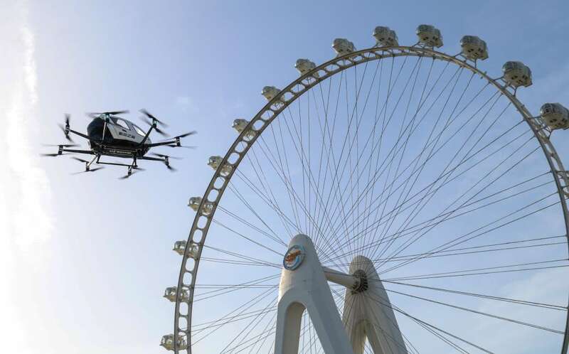 这是2025年4月16日在深圳市宝安区城市空中交通运营示范中心拍摄的亿航eVTOL航空器进行展示飞行。